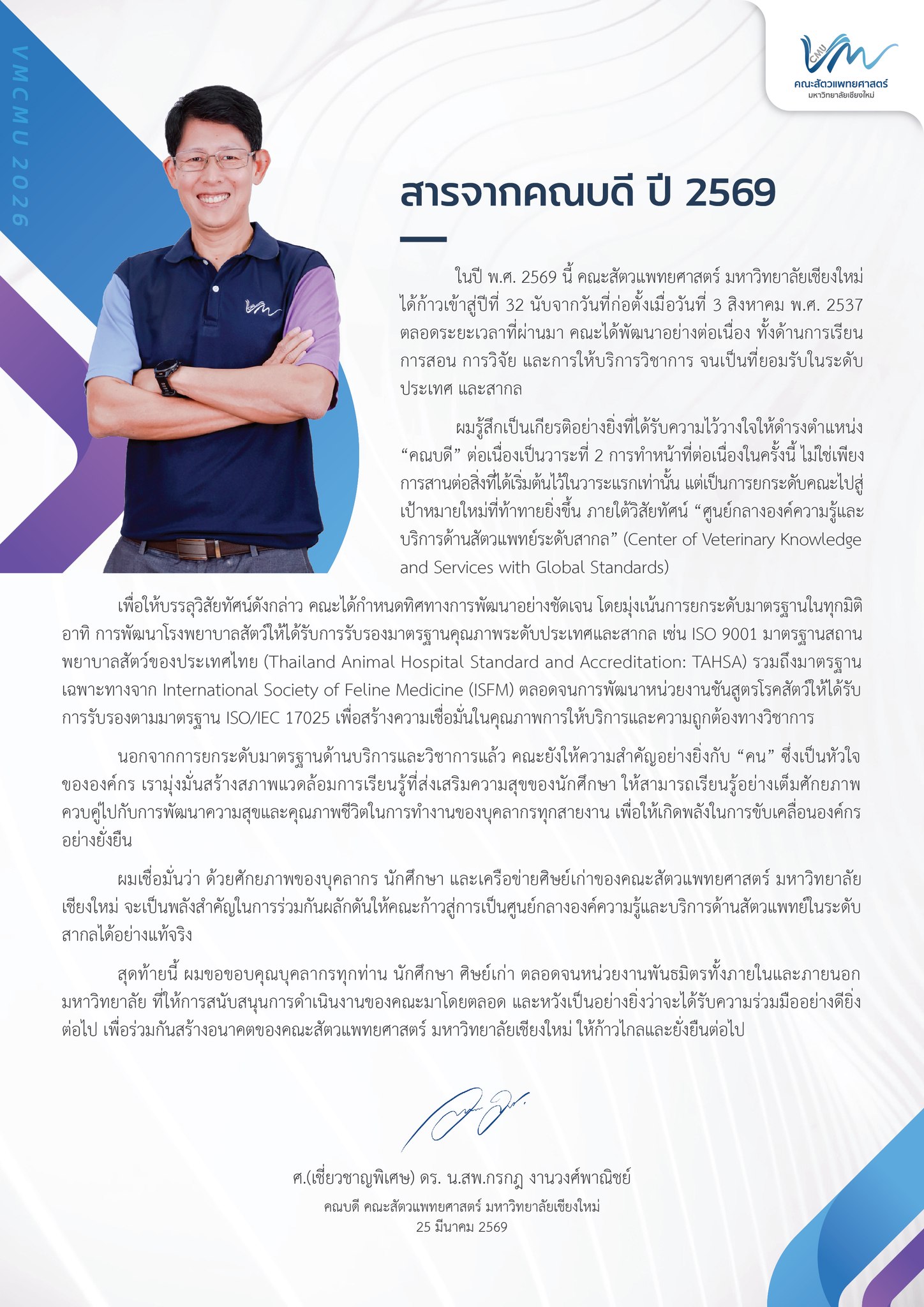 ผมเชื่อมั่นว่า คณะสัตวแพทยศาสตร์ มหาวิทยาลัยเชียงใหม่ มีบุคลากรทั้งสายอาจารย์และสายสนับสนุนที่มีความรู้ ความสามารถ รวมทั้งมีพลังของศิษย์เก่าที่สำเร็จการศึกษาไปแล้วกว่าหนึ่งพันคน ที่จะสามารถมาช่วยกันส่งเสริม พัฒนา และผลักดันให้คณะสัตวแพทยศาสตร์ มหาวิทยาลัยเชียงใหม่ มีความก้าวหน้าต่อไปอีกมาก ในฐานที่ผมได้รับการแต่งตั้งให้มาปฏิบัติหน้าที่ “คณบดี” คณะสัตวแพทยศาสตร์ เป็นคนที่ 5 นับตั้งแต่มีการจัดตั้งคณะมา จะพยายามนำความรู้ ความสามารถ ประสบการณ์ และเครือข่าย มาใช้ในการบริหารองค์กร ช่วยผลักดันและพัฒนา ให้คณะสัตวแพทยศาสตร์ มหาวิทยาลัยเชียงใหม่ ก้าวต่อไปข้างหน้าได้อย่างมั่นคง เป็นเสาหลักในการพัฒนาและสร้างบัณฑิตสัตวแพทย์ที่มีความรู้ ความสามารถ และเป็นคนดีในสังคม เสาหลักในการดูแลสุขภาพสัตว์ของประชาชนที่อยู่โดยรอบทั้งในจังหวัดเชียงใหม่และจังหวัดใกล้เคียง และเสาหลักในการพัฒนาสร้างสรรค์องค์ความรู้ใหม่ให้แก่สังคมวิชาการ